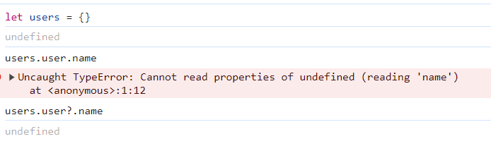 이렇게 중첩된 객체에서 존재하지 않는 특정 property를 조회할 때 오류 없이 항상 undefined를 반환하고 넘어가게 해주는 문법이 optional chaining이다.
