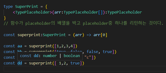 우리는 call signature 를 작성할 때, 여기 들어올 확실한 타입을 모를 때 generic을 사용한다. concreate type중 하나겠지만 그 조건들의 타입의 정의를 일일이 다 작성할 수 없다.