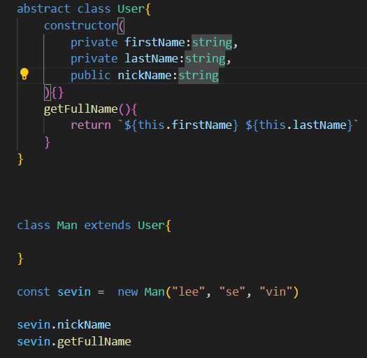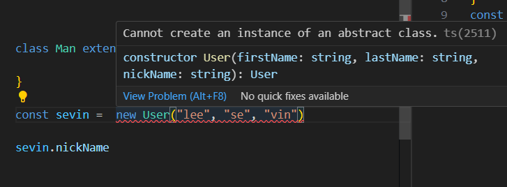 타입스크립트는 추상클래스의 인스턴스를 만들 수 없다고 경고한다.